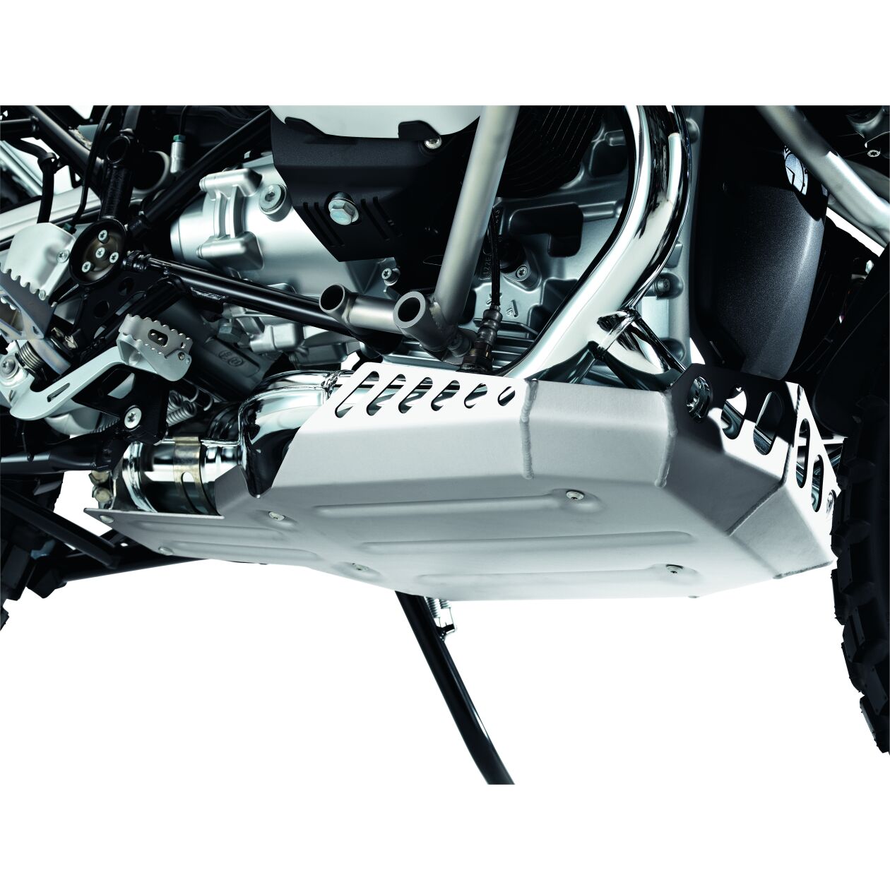 Protecția robustă din aluminiu pentru motor, de culoare argintie, protejează în mod eficient zona inferioară împotriva fragmentelor de piatră și deteriorării, de exemplu la lovirea părții inferioare. Nimic nu stă în calea unei excursii off-road. Chiar și cei care conduc pe carosabil vor aprecia aspectul off-road discret.